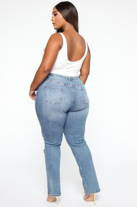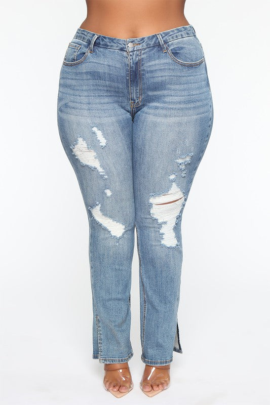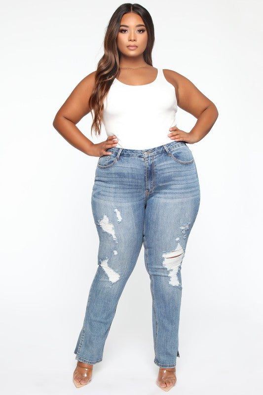 Our distressed denim pant makes the perfect stylish bottom for any top or bodysuit you decide to pair them with. A slightly snug fit, this denim pant is sure to compliment your shape and complete any look. Detailed rips make it the ideal bottom for a casual event. However, no matter the occasion you are for sure to look fabulous.