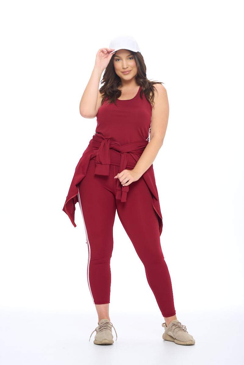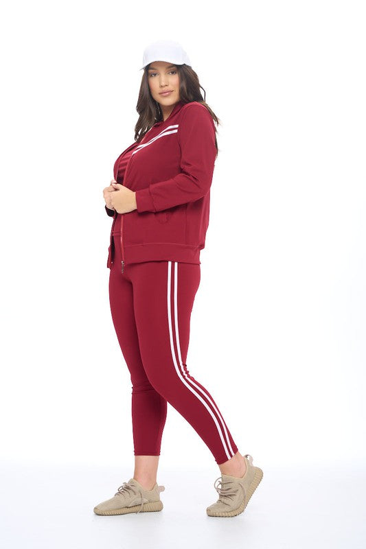 3 piece set comes with a tank top, zip-up hoodie, and leggings Zipper closure at front Side welt pockets Inspired for athleisure Double design contrast stripes Lightweight fabric for daily comfort Low to medium impact
