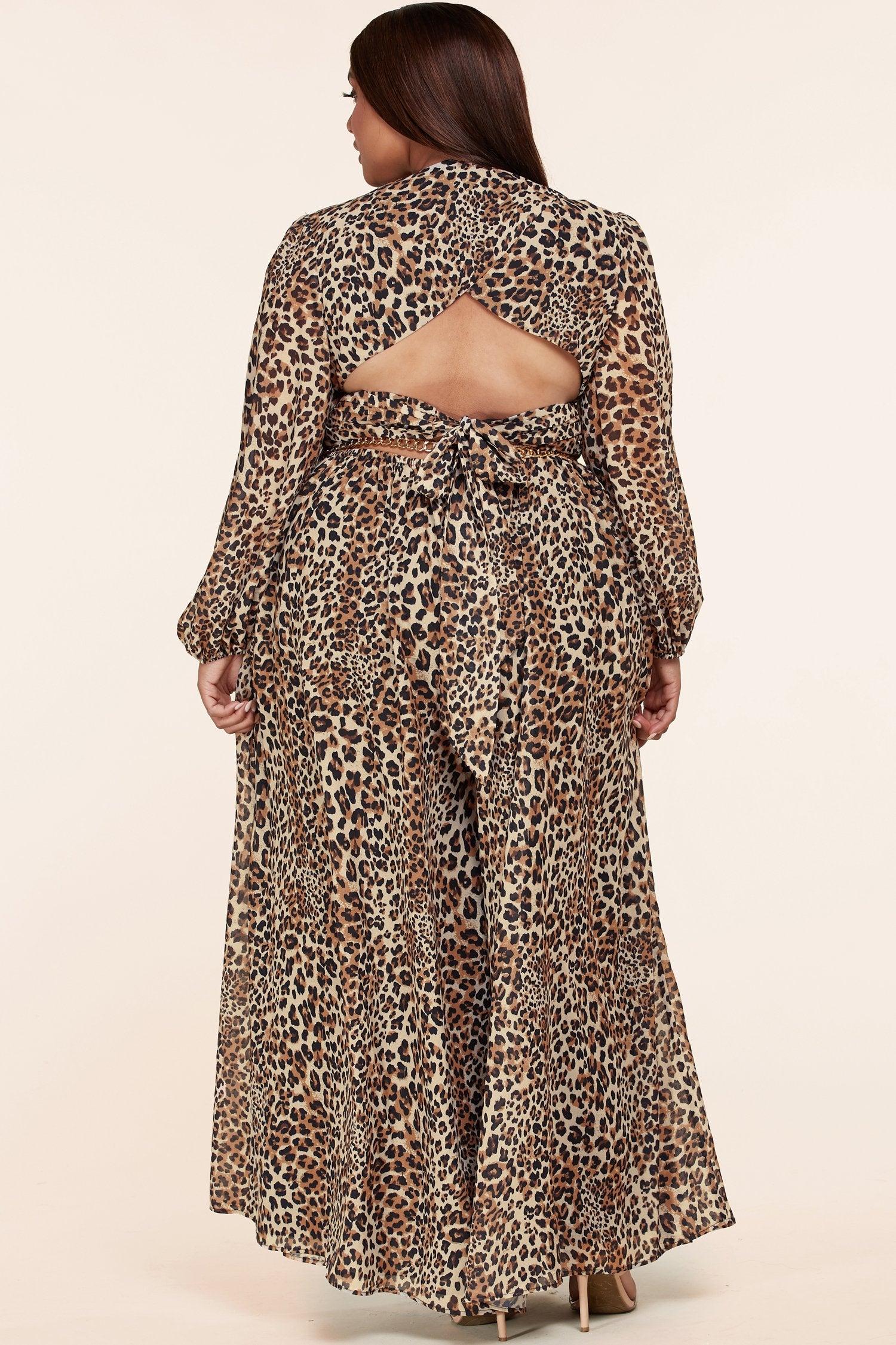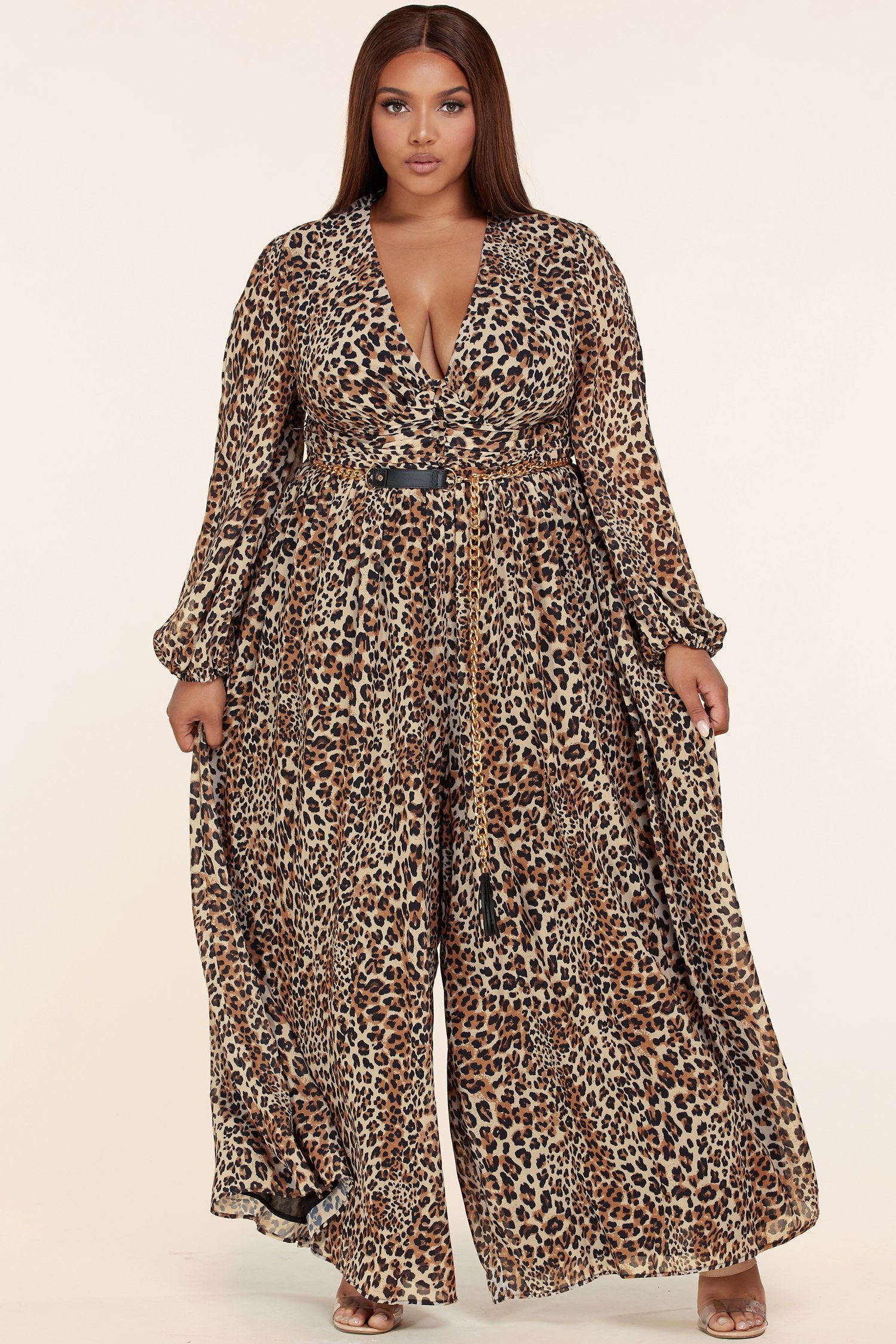 Long sleeve leopard print jumpsuit with a V-neckline and open back lead the eye from a ruched empire waist with fabric buttons at the bodice down to flare pants. A self-tie bow adds detail to the open back while a black belt with golden chain & a tassel cinches the waist.