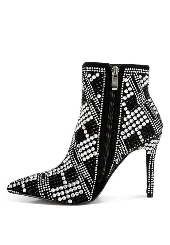 Opulent, indulgent, comfortable - meet your new ankle-length stiletto boots. They have a soft microfiber upper and patterned rhinestone embellishment. With a side zipper fastening and 4-inch rhinestone-studded stiletto heel, these party boots are one pair that will soon turn into your price possession.