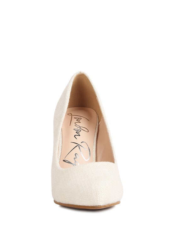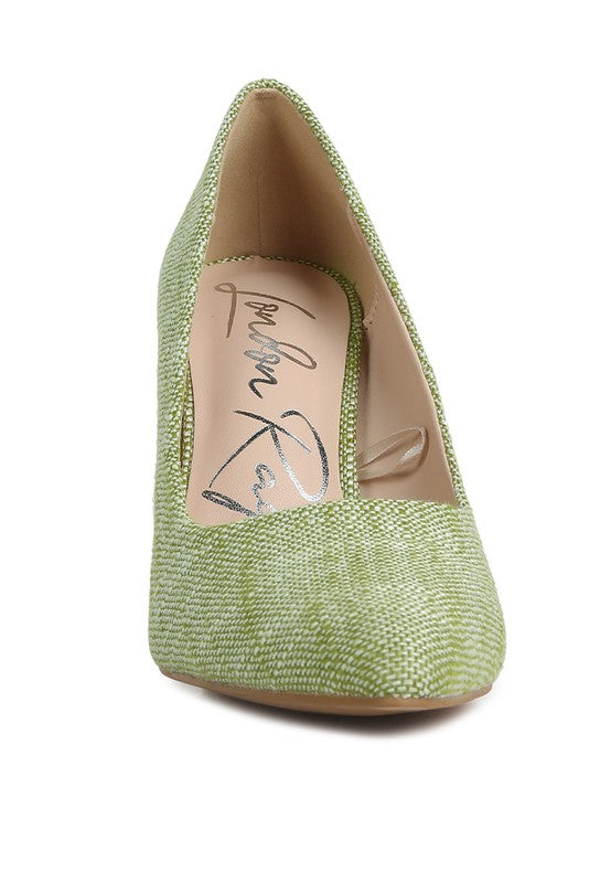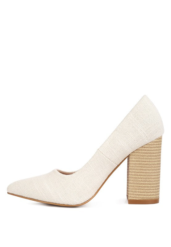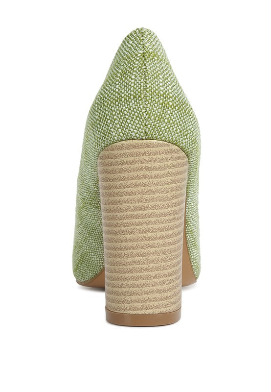 Elevate your look with these canvas textile pumps featuring stacked block heels. The perfect blend of comfort and style, these pumps add a trendy touch to any outfit. Whether you're dressing up for a special occasion or keeping it casual, these pumps offer versatile fashion that's sure to turn heads.