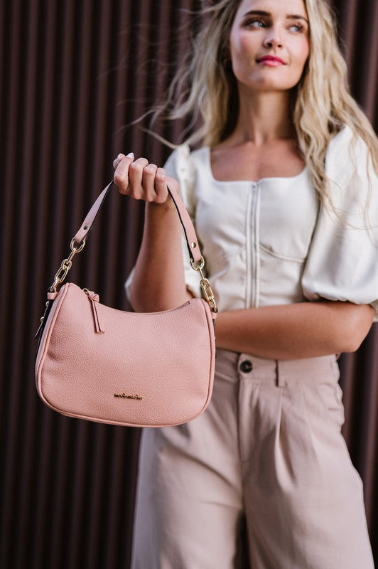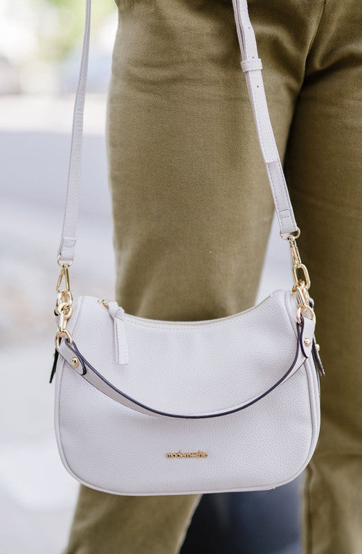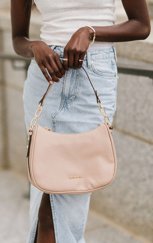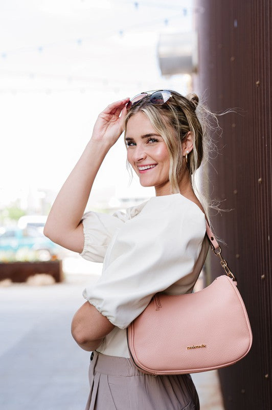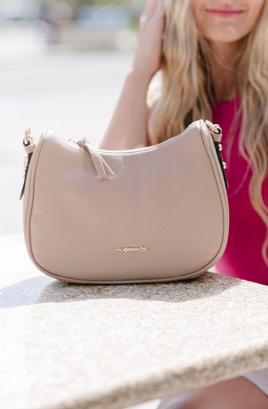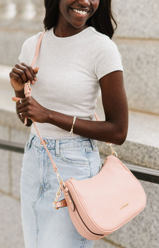 Elevate your ensemble with the Ashton Crossbody! With its luxe, lightly pebbled vegan leather body and glossy gold hardware, this stunning saddle bag is the perfect piece to take your outfit to the next level. Wear it on your arm with gold chain and vegan leather handle or add the adjustable vegan leather strap for crossbody wear.