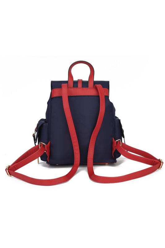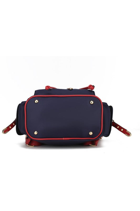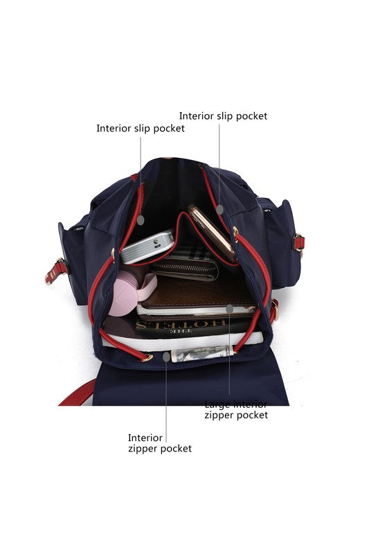 Exterior details: a front deep zipper pocket and two side pockets with magnetic snap closure